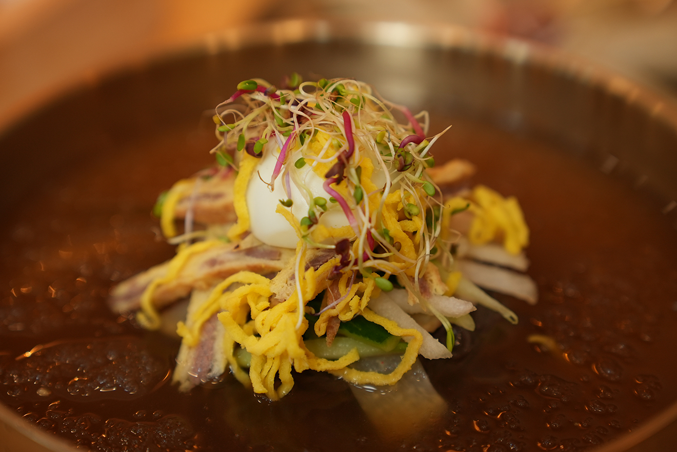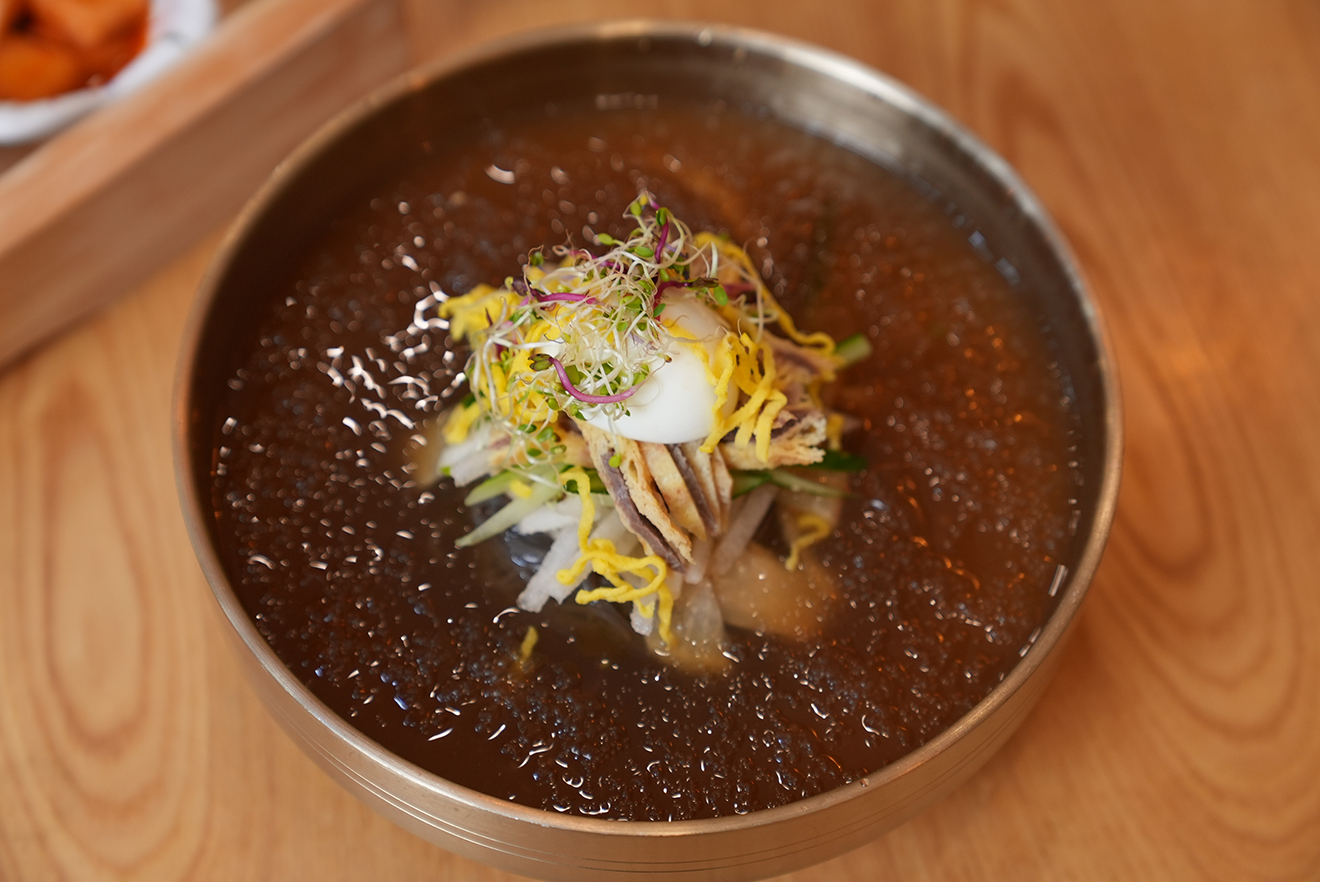 각종 해산물로 육수를 만들고 고명으로는 소고기 육전과 배, 오이, 새싹 등이 올라가서 지금까지 드셔보셨던 냉면과는 비주얼 자체가 다릅니다.